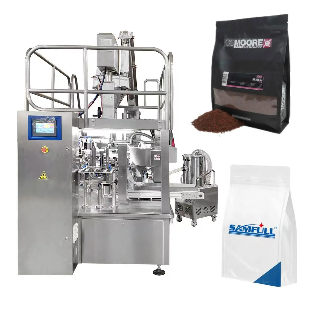 This premade pouch rotary packaging machine is designed for automatic filling and sealing of powder, coarse granules, and mixed material products. In addition to fishing groundbait, it is suitable for feed mixtures, bait additives, fertilizer blends, chemical powders mixed with granules, and other heterogeneous materials.